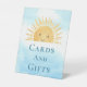 Das Schild "Cards and Gifts Baby Shower Pedestal Sign" ist mit einer gelben Aquarellfarbe, die die Sonne lächelt, einer stilvollen Typografie und einem blauen Himmelshintergrund ausgestattet. Original Wasserfarbe © Michele Davies.