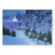 Eine 3D-Fantasielandschaft voller schillernder Schnee und zauberhafter Lichter. Eine Reihe von silbernen Glühlampen beleuchtet den Weg durch einen schneebedeckten Bergpass, der von steilen Felsklippen eingezäunt ist. Der schneebedeckte Pfad wird von dunklen Tannenbäumen eingezäunt. Auf der anderen Seite der Kluft erwartet der verzauberte Reisende auf seiner Reise nach Märyland ein durchsichtig leuchtendes Märchenschloss.