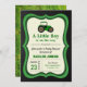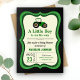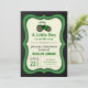 Erleben Sie die coole Traktor-Babydusche mit einem niedlichen grünen Bauerntraktor mit moderner Typografie auf einem Kalkbrett. Fügen Sie einfach Ihre Veranstaltungsdetails zu dieser einfach zu bedienenden Vorlage hinzu, um sie zu einer einmaligen Einladung zu machen. Dreh die Karte auf, um eine schöne grüne Grasstruktur auf der Kartenrückseite zu zeigen.