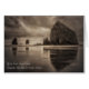 Haystack Rock and The Needles spiegelten sich während eines stürmischen Morgens am Cannon Beach in Oregon im feuchten Sand wider.