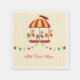 Eine Papierserviette mit Karussell und festlichem Stern, die Fahnen auf hellgelbem Hintergrund mit subtilen Streifen zusammenlegt. Ideal für eine Zirkusveranstaltung. Koordinierung der Einladung verfügbar.