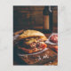 Käseseburger mit Rinderpatty, Weisheit-Schweizer Käse, Schinken, Champignons mit Sauce, Dijon-Senf, Mayonnaise und Kartoffelrolle. Flasche von handgearbeitetem Bier und rohen Teil im Hintergrund.