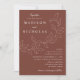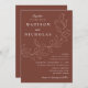 Botanische Hochzeitseinladungen mit Ihren Namen und Hochzeitsdetails in weißer Schrift geteilt durch eine Weinrebe mit skizzierten Blätter mit braunem Hintergrund. Die eleganten Einladungen für Hochzeiten stimmen sich mit unserer Cascading Blätter Hochzeitskollektion ab.