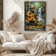 Dieses wunderbare Bild zeigt einen Bären, der als Feuerwehrmann verkleidet ist, eine Sonnenbrille und einen Helm trägt, eine akustische Gitarre schlüpft und auf einem Mooskohl in der Nähe eines pulsierenden Wasserfalls steht. Ein Glas goldener Honig wird daneben platziert. Die Kulisse ist ein üppiger Wald mit Sonnenlicht, der durch die Blätter gleitet. Die dicken, strukturierten Pinselstriche verstärken den whimsikalen und süßen Charakter der Szene, wobei "Liebe My Honey" hervorgehoben dargestellt wird.