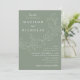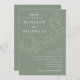 Botanische Hochzeitseinladungen mit Ihren Namen und Hochzeitsdetails in weißer Schrift geteilt durch eine Weinrebe mit skizzierten Blätter mit schlauer grünem Hintergrund. Die eleganten Einladungen für Hochzeiten stimmen sich mit unserer Cascading Blätter Hochzeitskollektion ab.