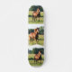 Kastanienpferd galoppierend und stehend auf einem Gebiet auf einem entworfenen Reiterskateboard.