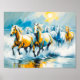 atemberaubendes Ölgemälde einer Gruppe hellbrauner Pferde, die durch flaches Meerwasser galoppieren, Bewegung und Energie aufnehmen. Die warmen Farbtöne kontrastieren wunderschön mit den coolen Ozeanfarben.