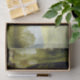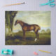 Dieses Design zeigt ein Gemälde des englischen Künstlers George Stubbs (1724-1806), der für seine Darstellung von Pferden berühmt wurde. Es zeigt ein elegantes Racehorse mit einem schönen, kastanienfarbenen Mantel stehend im Profil. Sein Körper ist stark und schlank. Das Pferd ist frei und frei in einer Landschaft neben einem alten Weidenbaum mit Algen, umgeben von grünen Wiesen, stehend. Die Ohren des Pferdes sind zurück, was darauf hindeutet, dass das Tier aufmerksam ist und Befehle oder Geräusche in der Umgebung hört. Ein Rennpferd wie dieses könnte bis zu 50 Meilen pro Stunde galoppieren.