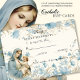 Mit einer wunderschönen, maßgeschneiderten Taufkircheinladung mit einer blühenden Blues, der gesegneten Jungfrau Mary, die Jesus hält, und einem Schriftstellervers vorne. Alle Texte und Schriftart können geändert werden.
