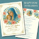 Mit einer wunderschönen, maßgeschneiderten Taufkircheinladung mit einem Vintagen religiösen Bild der gesegneten Mutter und des Babys Jesus, das mit rosa und blau blumengeschmücktem Design und der Schrift Verse betont wurde.