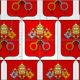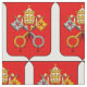 Es ist ein rotes Schild mit zwei Kreuzstiften (aus Paradise und Rom) verbunden mit einem Scharlachrot. Die Papaltiara liegt über den Tasten.