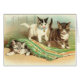 Vintage Illustration des Spielens mit drei Kätzchen. Ein ist unter der Wolldecke, die heraus späht.