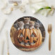 Eine Gruppe von Kätzchen ist in einem großen, geschnitzten Kürbiskürbis-Set an einer rustikalen Scheune versteckt.