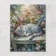 Eine Katze rollte auf einer Bank im Blumengarten auf