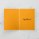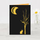 Diese Halloween-Karte zeigt eine goldene, gelbe Katze unter einem bloßen goldenen Baum unter einem stilisierten Mond, die direkt vor einem tiefen schwarzen Hintergrund auf Sie blickt.
