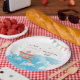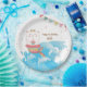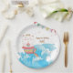 Katzen Geburtstagsparty-Teller haben eine farbenfrohe Katze-Meerjungfrau auf ihnen. Es gibt Meereswellen, die bis zu diesem Raubtier, der Katze, dem Caticorn, abstürzen.