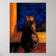 Dieses Poster enthält eine prächtige goldene, orange und braune Tortoiseshollenkatze, die auf einem roten Kissen sitzt und aus dem Fenster in einen dunkelblauen Himmel starrt. Sie wirft einen Schatten auf das vergoldete Holzfenster. Ich habe mein Originalfoto digital verbessert, um einen malerischen Effekt zu erzielen.