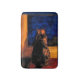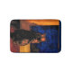 Diese Badematte verfügt über eine prächtige goldene, orange und braune Tortoiseshollenkatze, die auf einem roten Kissen sitzt und aus dem Fenster in einen dunkelblauen Himmel starrt. Sie wirft einen Schatten auf den goldfarbenen Holzfenster-Sessel.