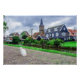 Fischerstadt. Malerei von traditionellen Holzhäusern, Kanal und Katze in Marken, Niederlande. Blick auf Kanal, Brücke und traditionelle Fischerhäuser im Wasserland Dorf. Traditionelle Holland-Symbole.