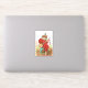 Dieser Vinyl Aufkleber hat eine Katze in einem roten Clownoutfit mit einer Ruffel, die auf einer blauen Trommel sitzt und eine Mandoline auf einem hellrosa Hintergrund spielt.