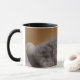 Eine niedliche graue Katze, die sich auf dem Boden betrachtet recht Ihnen in einer sehr vertrauten Katzen-Pose mit den Tatzen hinlegt, kräuselte sich. Das Foto bedeckt die gesamte Tasse. Wenn Sie linkshändig sind, können Sie die Tasse besonders anfertigen, indem Sie leicht das Foto aufheben.