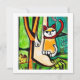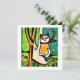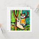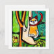 Eine Katze auf einem Baum sieht dubitant aus; eine Stadt im Hintergrund, im naiven Stil.