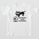 Eine schwarz-weiße Katze nickt auf einen Fußball. Der humorvolle Text lautet "Der Jäger wirft keinen Schatten". Der Ball wirft einen Schatten, aber die Katze nicht." Die Katze ist schwarz und hat große weiße Augen, sie hat keine anderen Gesichtszüge oder Flüstern.