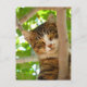 Portrait Foto einer Katze mit klaren grünen Augen, die an einem sonnigen Tag auf einen Baum klettern.