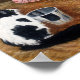 Eine schwarz-weiße, langhaarige Tuxedo-Katze sitzt in einer Scheune und sieht eine schwarz-weiße Kuh mit Kalb an. Ist er im glänzenden Silbereimer für Milch gewartet?