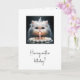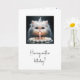 Eine flauschig weiße Perserkatze mit einem Geburtstagshut mit einer rosa Zunge, die den Zuckerguss lecken kann, kann gewechselt werden.
