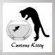 Silhouette einer seltsamen Katze, die in eine Fischschüssel guckt, während der Fisch zurückblickt.
