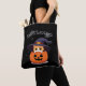 Katze mit einem Magier, Zauberer oder Hexenhut in einem Halloween-Jack-O-Lantern oder Jack-O’Lantern zu Halloween mit Cat O’Latern Pun