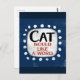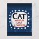 Ein unumkehrbares und niedliches typografisches Tierdesign, das "Katze will ein Wort" sagt. Er ist mit schwarzem und rotem Text auf einem weißen Rechteck mit funky, spielerisch weißen Punkten umgeben, die alle auf blauem Hintergrund dargestellt sind.