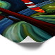 A.I. hat eine stehende Musikerkatze in lebhaften Kleider erschaffen, die inmitten einer surrealen Landschaft mit Bäumen und einer strahlenden Sonne eine Schlampe spielt.