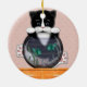 Eine Schwarzweiss-Katze, die an einem fishbowl mit zwei grünen Fischen nach innen hängt. Das fishbowl sitzt auf einen Woodgrainaufbereiter. Der Hintergrund ist eine Sternexplosion im Rosa mit wenigen Tatzendrucken.