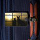 Ein Gepäckanhänger mit Hund und Katze, die durch das Fenster schauen, wahrscheinlich für Sie, um wieder zu kommen! Ganz personalisiert auf der gedreht Seite mit Ihren Kontaktinformationen.