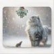 Eine flauschige Katze und eine winzige Maus blicken auf einen Haufen Mistelen, die mit einem roten Bogen geschmückt sind, während Schneeflocken sanft um sie herumfallen