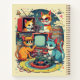 Journal in einer skurrilen Illustration mit vier spielerischen Katzen, die Retro-Medien genießen. Eine Katze sitzt neben einem Vintagen Fernseher, während eine andere, die eine rote Brille trägt, auf Buchstapeln und Platten steht. Ein Turntable- und Kassettenspieler erinnert an eine Ästhetik aus der Mitte des Jahrhunderts.