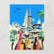 Postcard in einer Abbildung von drei stilvollen Katzen, die als Touristen stehend vor einem futuristischen Stadtbild gekleidet sind. Die Architektur erinnert an die Science-Fiction-Ästhetik der Mitte des Jahrhunderts. Die Katzen halten Kameras, Karten und tragen Lanyards, was ein Abenteuer nahe legt. Palmen und ein leuchtend blauer Himmel sorgen für eine angenehme Urlaubsatmosphäre.