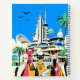 Journal in einer Illustration von drei stilvollen, als Touristen stehend gekleideten Katzen vor einem futuristischen Stadtbild. Die Architektur erinnert an die Science-Fiction-Ästhetik der Mitte des Jahrhunderts. Die Katzen halten Kameras, Karten und tragen Lanyards, was ein Abenteuer nahe legt. Palmen und ein leuchtend blauer Himmel sorgen für eine angenehme Urlaubsatmosphäre.