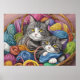 Dieses Poster vereint eine herzzerwärmende Szene mit zwei bezaubernden Katzen, die in einem gemütlichen Korb inmitten eines Geflechts aus farbenfroher Wolle eingebettet sind.