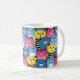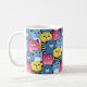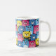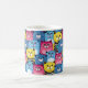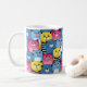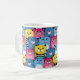 Eine farbenfrohe Tasse mit einem spielerischen Muster von Cartoon Katzen in verschiedenen Farben und Ausdrücken.