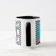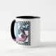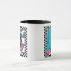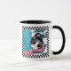 Dieses TassenAusrüstungsbeschreibungen eine Tuxedokatze, die seinen Kopf auf seinen Inhaberfüßen stillsteht, während sie Frühstück macht. Das Bild wird durch eine überprüfte Schwarzweiss-Grenze umgeben und erscheint auf beiden Seiten von der Tasse. Copyright © Lisa Marie Robinson. Alle Rechte vorbehalten.