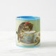 Kundenspezifische Tasse mit viktorianischer Vignette einer Katze, die von einem Teacup nippt.
