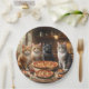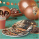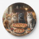 Vier Katzen sitzen um einen Tisch herum und eine Pizza ist zum Essen bereit.