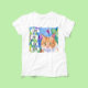 Whimsical Folk Art Aquarellkatze Orange und blau und violett Blumen Hemd. Zitat: "Katzen sind mein Stamm." Generativitäteninhalt
