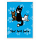 Eine kundengerechte Grußkartenschablone, die drei Cartoonkatzen kennzeichnet. Ein Tabby, ein schwarz und ein Weiß auf einem vibrierenden blauen Hintergrund mit helleren blauen pawprints.