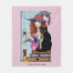 Eine niedliche Rothaarhexe, lila mit ihrer schwarzen Katze, die auf einem Haufen Bücher sitzt. Tränke, Spinne und eine Kerze im Hintergrund von rosa