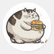 Eine dicke Katze, die einen Hamburgeraufkleber isst, würde wahrscheinlich einen Cartoon oder ein illustriertes Bild einer Katze mit einem großen, runden Bauch haben, der einen Hamburger konsumiert. Die Katze kann aufrecht sitzen und den Burger in ihren Pfoten halten, und ihr Mund könnte durch einen Biss weit offen sein. Der Hamburger kann mit Kopfsalat, Tomate, Käse, Ketschup oder Senf aufwarten, und auf dem Gesicht oder den Klauen kann es Fett oder Krümel geben. Der Aufkleber kann für die Verwendung auf Geräten wie Laptops, Wasserflaschen oder Notebooks konzipiert sein.