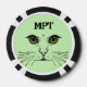 Diese Poker-Chips haben ein schwarzes Gesicht mit hübschen grünen Augen und langen Flüstern auf hellgrünem Hintergrund. Passen Sie Ihre Initialen oder Texte mit den Vorlagen an.